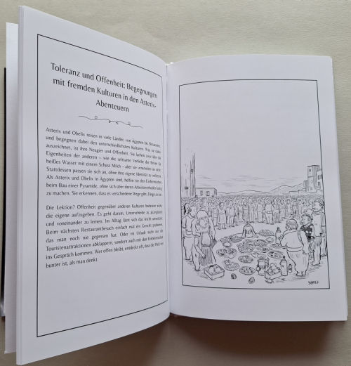Ich bin mir sehr sicher, dass der Inhalt auch dieses Buches von einer KI kreiert wurde, sehr wahrscheinlich in Bezug auf Zeichnungen und Texte. Allerdings sind die Texte hier anders geartet als bei den zuvor besprochenen Werken. Handelte es sich dort um ein Sammelsurium von aus dem Internet zusammengeklaubten Fakten, werden hier Lebens- und Alltagsweisheiten bzw. gute Ratschläge für Verhaltensweisen zum Besten gegeben und vorgeblich aus den Asterix-Geschichten abgeleitet. Dabei merkt man als Leser sehr schnell, dass der Asterix-Bezug sehr oberflächlich (in Einzelfällen auch unpassend) bleibt.