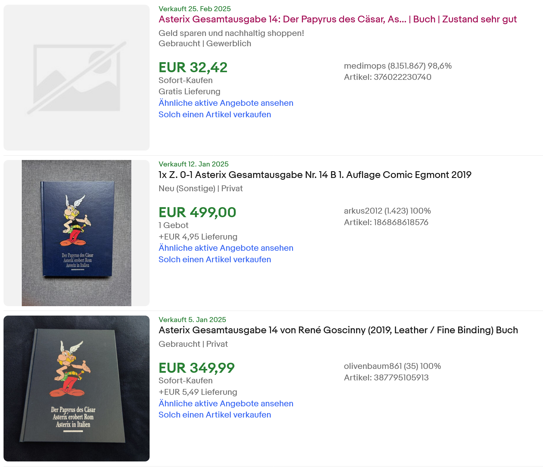 Ich kann daher die Vermutung von Idemix nur bekräftigen: Wäre ich nicht in diesem Forum hier aktiv, käme ich nicht einmal ansatzweise auf die Idee, überhaupt nur über den Verkauf dieser Bände nachzudenken. Mache ich mit allen anderen Büchern in meinem Bücherregal ja auch nicht (selbst mein vor kurzem erfolgter Umzug war kein Anlass dafür). Ich gehe daher sogar davon aus, dass nicht nur "der eine oder andere Band irgendwo in einem Bücherregal verstaubt", sondern dass es den allermeisten (> 90%) der Käufer von Band 14 so geht: Sie haben ihn im Regal und kommen im Traum nicht drauf, dass sie ihn für hunderte von Euros verkaufen könnten, weil sie ihn für ein Buch wie jedes andere halte, das sie wie jedes andere in ihrem Regal irgendwann zum regulären Preis im Buchhandel gekauft haben. Oder prüft ihr regelmäßig für alle eure Bücher im Schrank, zu welchen Preise sie verkauft werden können?
