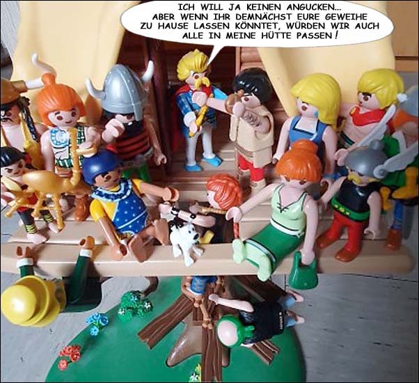 Sehr schön. Überhaupt könnte man mal alternative Asterix-Welten entstehen lassen. So nach dem Motto, wie wäre die Geschichte gelaufen, wenn eine Initialszene nicht so stattgefunden hätte, wie sie im Original gezeichnet wurde. Könnte man dann auch mit Playmobilfiguren nachstellen.