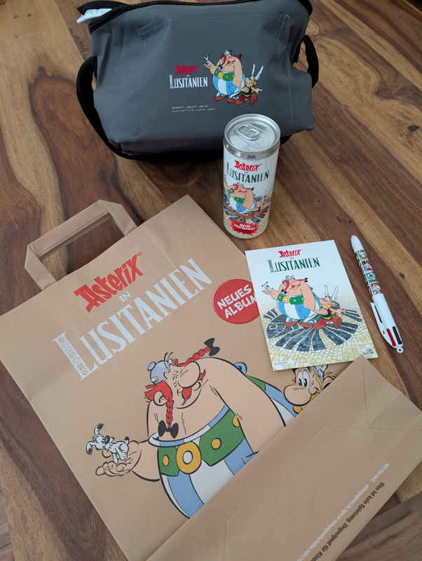 Deshalb: Je früher wir einen Termin haben, desto größer die Wahrscheinlichkeit. Heute kam auch ein schönes Paket vom Verlag. Das ist alles Material zum Verschenken beim Fantreffen. Eine Papiertasche, eine Kühltasche, ein isotonisches Getränk in einer Asterix-Dose (hoffentlich Zaubertrank und kein Garum), eine Postkarte und ein Kugelschreiber.