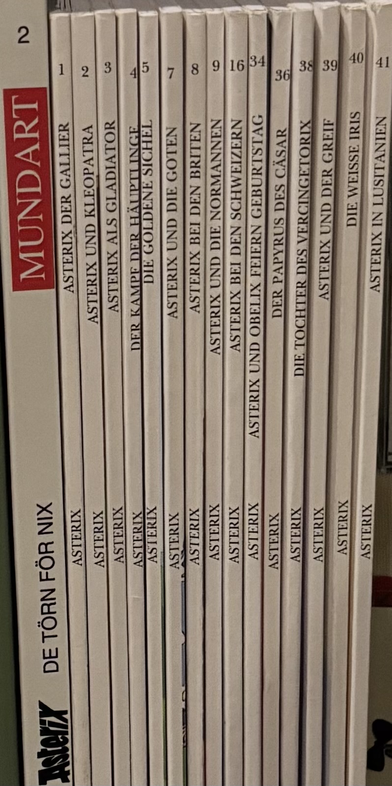 Ich wollte nur mal nach euren Asterix Sammlungen fragen.Meine ist nicht groß sie enthält nur Asterix snackt Platt DE TÖRN FÖR NIX,Asterix der Gallier,Asterix und Kleopatra,Asterix als Gladiator,Der Kampf der Häuptlinge,Die goldene Sichel,Asterix und die Goten,Asterix bei den Briten,Asterix und die Normannen,Asterix bei den Schweizern,Asterix und Obelix feiern Geburtstag,Der Papyrus des Cäsar,Die Tochter des Vercingetorix,Asterix und der Greif,Die weiße Iris und Asterix in Lusitanien.