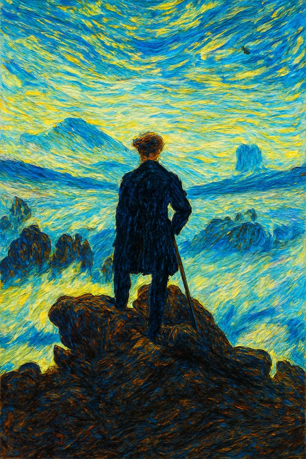 WeissNix hat geschrieben: 25. März 2026 18:21 Den Wanderer über dem Nebelmeer von Caspar David Friedrich mit einem Hintergrund im Stile van Goghs?