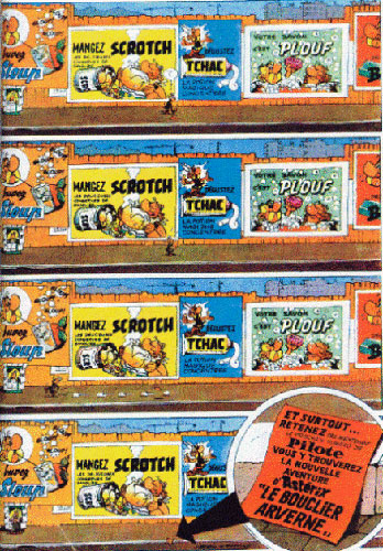 Am 8. Juni 1967 kündigt sich den Lesern des Magazins Pilote auf der letzten Seite der Ausgabe 398 eine weitere Episode an. Vor einem alles überragenden Bauzaun, auf dem grellbunte Plakate mit dem Konterfei von Asterix und Obelix für diverse Produkte werben, liest ein kleines Männchen einen Handzettel vom Gehweg auf, auf dem der neue Band "Asterix und der Arvernerschild" angekündigt wird (Abbildung).