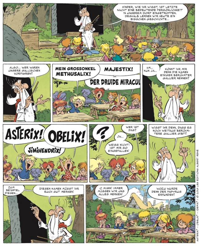 Davor erschien eine Sequenz mit Miraculix in der Dorfschule, die die ersten Hinweise über die Thematik des 38. Albums gab. Auf die Frage, wer die gallischen Vorfahren gewesen seien, antworten die Kinder u.a. mit "Asterix!", "Obelix!" und "Jimihendrix!". Selbstverständlich erwartete der Druide auch die Nennung von Vercingetorix, dem historisch überlieferten Anführer des gallischen Widerstands (Abbildung).