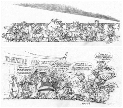 Diese vier Zeichnungen werden in "Asterix und Obelix feiern Geburtstag ab Seite 39 im Rahmen dieses Albums abgedruckt. Das erste Bild etwas abgewandelt - statt den Schauspielern Christian Clavier und Gérard Depardieu sind René Goscinny und Albert Uderzo abgebildet - und die weiteren Bilder koloriert und mit deutschsprachigen Sprechblasen.