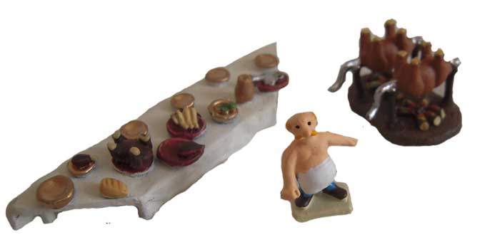 Diese 2 cm große Figur des Bratspießdrehers aus Metall wie die Wildschweine am Spieß als auch das zweite Teil des Banketts aus Resin erschienen im Rahmen der Sammelserie von Hachette "Das gallische Dorf des Asterix" im Juni 2013 in der Ausgabe 20. Die Sammelserie konnte mit allen Ausgaben (60 Hefte mit etwa 200 Teilen) zu einem Gallierdorf kombiniert werden konnten.