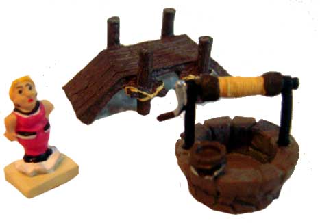 Gutemine mit Nudelholz im Rücken, ein Brunnen und eine Brücke