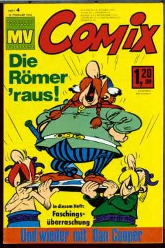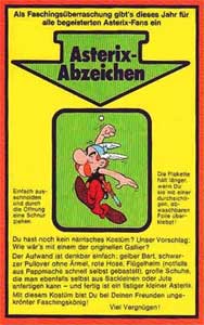 Als deklarierte "Faschingsüberraschung" schon mit Hinweis auf dem Titel wurde in das Heft Nr. 4/72 vom 12. 2. 1972 aus der Reihe "MV Comix" von Ehapa verlagßeitig als loses Asterix-Extra ein Kanevalsabzeichen auf einem Pappträger eingelegt. Bei dieser MV-Beilage handelt es sich um einen rot umrandeten, gelben Pappbogen, auf dem der einem seitlich zugewandte Asterix als Abzeichen vorgestanzt ist. Da man dieses mit leichtestem Druck aus dem Bogen lösen konnte, hat der lose Beilagebogen ohne das schützende Heft auch gerne das Abzeichen verloren, was ihn heute zu einem gesuchten, recht seltenen und dementsprechend teuren Sammlerstück macht.