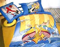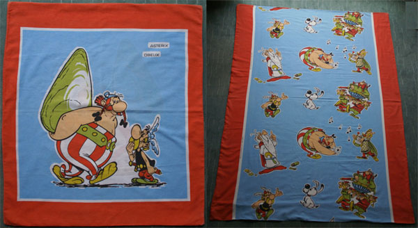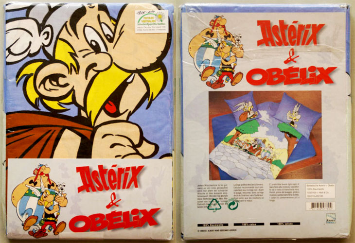 Bereits aus dem Jahr 1975 sind die ersten Bettwäschegarnituren mit Asterix-Motiven bekannt. In etwas eigenwilliger Farbgebung orange/grün und blau/rot betragen die abgemessenen Masse beim Deckenbezug 183 x 135 cm und beim Kissen 73 x 68 cm, was jedoch auch durchaus mit einem eingelaufenen Stoff erklärt werden kann. Das Etikett in der Bettwäsche weist deutschen Text auf ("Qualitätsbettwäsche Augsburg" und "100% Baumwolle").