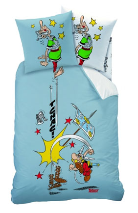 Beim Onlineshop von DeineBettwaesche.de werden seit Mitte 2008 mehrere verschiedene Bettwäsche-Garnituren (Bettbezug 140x200cm, Kopfkissen 70x90cm) mit Asterix-Motiven für jeweils etwa 40 Euro und Kopfkissen für 10 Euro angeboten. Die Bettwäsche (trocknergeeignet und waschbar bei 40° Grad) besteht zu 100 Prozent aus Baumwolle. Ein leichtes Beziehen soll durch den verdeckt eingearbeiteten Qualitäts-Reissverschluss aus Kunststoff möglich sein. Ein Motiv zeigt - passend zum Erscheinen des Kinofilms "Asterix bei den Olympischen Spielen" - das Titelbild des Albums und - auf dem Kissen - die rennenden Musculus und Obelix (zweites Bild von oben). Ein anderes Motiv (rechts oben) zeigt neutral Asterix, Obelix und Idefix. Ein weiteres hier nicht abgebildetes Motiv zeigt Asterix, Obelix und Idefix mit einer römischen Patrouille vor der Akropolis - das gleiche Motiv wird zudem in einer weiteren Variation mit einem Schmuckrand verkauft. Asterix, der einen Legionär schlägt, wird als Set mit Kopfkissen (Decke 135 x 200 cm, Kissen 80 x 80 cm) angeboten.