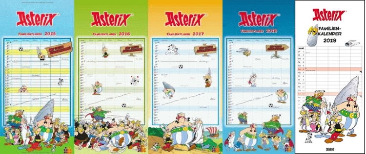 Seit 2014 verfügte der DuMont Kalenderverlag über die Rechte für die Veröffentlichung von Kalendern und Familienplanern mit Motiven aus der Asterix-Serie. Jeweils im Frühjahr erschien deshalb ein Familienplaner für das Folgejahr mit jeweils 12 Motiven aus Asterix-Abenteuern, Ausmalbildern auf jeder Rckseite und einer Jahresübersicht mit Ferienterminen zum Preis von etwa 10 Euro (Motivübersicht). Der Kalender hat das Format 21 x 45 cm, eine Spiralbindung und sechs Spalten zum Eintragen von Terminen.