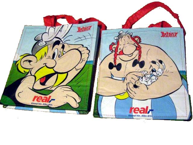 Zeitlich passend zu einer Aktion in den real-Märkten, bei der man für einen Mindesteinkauf Murmeln mit Asterix-Motiv bekam, erhielten Käufer eine Einkaufstasche aus Kunststoff mit Asterix-Motiv und einem real-Logo. Die Tasche hat jeweils ein unterschiedliches Motiv für Vorder- und Rückseite, ist 43x39 cm groß und bis zu 20 cm tief. Der Preis beträgt 0,99 Euro.