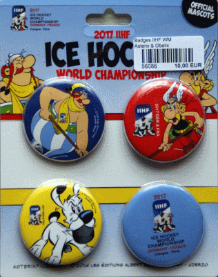 Zu einem Preis von 10 Euro wurden vier Badges (ansteckbare Abzeichen) im Set verkauft, drei davon mit Motiven aus der Asterix-Serie (Motivübersicht). Weitere Fan-Artikel zur Eishockey-Weltmeisterschaft findest du mit der Comedix-Suche.