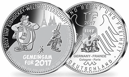 Anlässlich der Eishockey-WM 2017 in Köln und Paris wurden Asterix und Obelix offizielle Maskottchen dieses Wettbewerbs. In diesem Zusammenhang wurden verschiedene Produkte mit Asterix und Obelix Logo vertrieben. Unter anderem veröffentlichte das Unternehmen "MDM Münzhandelsgesellschaft mbH & Co. KG Deutsche Münze" 2017 eine Gedenkmedaille mit den Motiven von Asterix und Obelix als "erste offizielle Silber-Gedenkprägung zur 2017 IIHF Eishockey-WM" zum Preis von 10 Euro (grosse Ansicht).