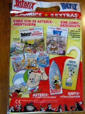 Im Herbst 2022 veröffentlichte Egmont Ehapa für etwa 9 Euro eine Verwertung der Asterix-Abenteuer in Form eines "Family-Packs" in einer Plastikverpackung. Die Verpackung (Abbildung rechts, Rückseite) beinhaltete jeweils eines von 39 Asterix-Abenteuern, ein 32-seitiges Comicheft mit einer Geschichte aus der Serie "Idefix und die Unbeugsamen", einem Asterix-Lesezeichen und einem Idefix-Türanhänger.