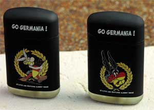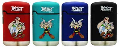 Vom Hersteller "V-Fire" wurden verschiedene Ausgaben von Sturmfeuerzeugen der Serie "V-Fire Easy Torch 8 Rubber" auch mit Asterix-Motiven vertrieben (Motivübersicht). Das 4 x 6 x 1,5 cm große Feuerzeug mit gummierter Oberfläche ist nach Herstellerangaben nachfüllbar und Spritzwasser geschützt. Es wurde für etwa 4 Euro nicht nur mit den in der Übersicht gezeigten Motiven und Farben angeboten, sondern auch in einer besonderen Edition mit dem Copyright von 2016 mit dem Aufdruck "Go Germania!" und deutscher Beflaggung (Motive). Gesichtet wurden die Feuerzeuge sowohl in Onlineshops im Internet als auch in einschlägigen Geschäften für den Raucherbedarf.