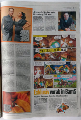 In der Ausgabe Nr. 1, vom 03. Januar 2021 (Abbildung rechts unten), sind Asterix, Obelix und Idefix auf der Titelseite mit der Schlagzeile "Exklusiv! Erster Blick in den neuen Asterix" und einem Verweis auf Seite 41 zu sehen. Auf Seite 41 ist ein Vorabdruck einer Asterix-Seite zu sehen, die möglicherweise nur eine Ankündigungsseite und kein Abdruck einer Seite des im Oktober 2021 erscheinenden Albums ist.