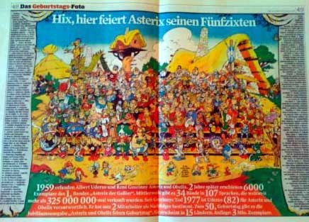 In der Ausgabe der "Bild am Sonntag" vom 25. Oktober 2009 wurde anlässlich des 50. Geburtstags von Asterix ein doppelseitiges, farbiges Mittelposter auf den Seiten 48/49 abgedruckt, das das "Familienfoto" unter namentlicher Auflistung sämtlicher Asterix-Charaktere am linken und rechten (als Vorhang gestalteten) Bildrand sowie unter dem Bild in Zahlen gegossene Fakten zu und rund um Asterix darstellte. Dieses Poster zum Jubiläum titelt mit "Das Geburtstags-Foto - Hix, hier feiert Asterix seinen Fünfzixten".