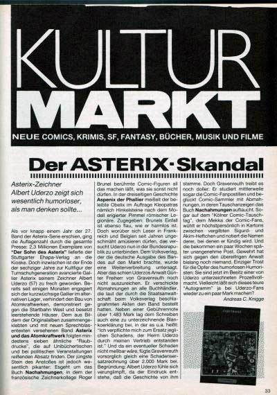 In "Cosmics" Nr. 2 von August 1984, das sich selbst als "Das Comicmagazin für Erwachsene" versteht und aus dem Abi Melzer Verlag stammt, ist unter dem Titel "Der Asterix-Skandal" ein ganzseitiger Beitrag von Andreas C. Knigge zum Thema Asterix-Raubcomics erschienen, in dem der Autor kritisch über die Verfolgung von Comicverfremdungen und (vermeintlichen) Parodien berichtet.