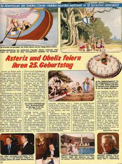 In Heft Nr. 19 von 1984 des deutschen TV-Magazins "Fersehwoche" ist auf Seite 16 ein ganzseitiger Artikel zum Thema "Asterix und Obelix feiern ihren 25. Geburtstag" von Klaus-Peter Ulbrich enthalten, der unter anderen farbigen Abbildungen auch eine von Karl-Heinz Graf von Rothenburg, dem Übersetzer der Asterix-Bände ins Lateinische, zeigt.