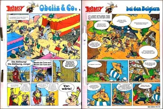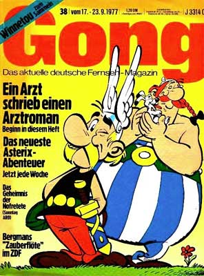 Nachdem das Erscheinen der Comic-Zeitschrift MV Comix, in der bisher die Asterix-Abenteuer in Deutschland zuerst veröffentlicht wurden, 1977 eingestellt wurde, erschien in der Fernsehzeitung "GONG" in den Ausgaben 38/1978 bis 20/1979 (die Abbildung zeigt die erste Ausgabe 38/1978) jeweils wöchentlich eine Episode des Abenteuers "Asterix bei den Belgiern" als Erstveröffentlichung. Schon zuvor erschien "Obelix GmbH & Co. KG" als "Obelix & Co." in den Ausgaben ab Nr. 38/1977 von September 1977 bis März 1978 ebenfalls jeweils wöchentlich, hier jedoch nicht als Erstveröffentlichung (Abbildung).