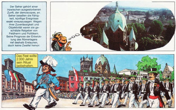 Auf humorvolle Weise spiegelt diese "Dokumentation" die Gründungsgeschichte von Neuss im Jahre 16 v.Chr. wider. Hauptakteure sind natürlich unsere berühmten Helden Asterix und Obelix. Die Abbildungen für diese Geschichte selbst wurden siebzehn Original-Abenteuern entliehen, vor allem aus den beiden Geschichten "Asterix bei den Belgiern" und "Der große Graben". Geändert wurden auch die Sprechblasen-Texte, was uns als Novität römische Legionäre bescherte, die sich in fließendem "Neusser Platt" verständigten.
