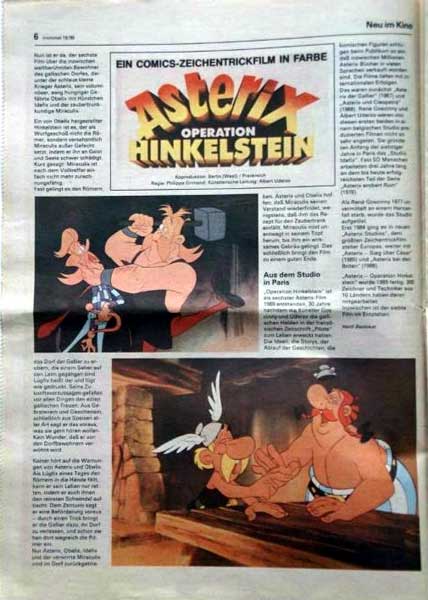 Was für die westdeutschen Heranwachsenden ihre BRAVO war, das war in Ostdeutschland ein Wochenmagazin namens TROMMEL, die Zeitung für "Leser ab zehn", herausgegeben im Verlag Junge Welt, Berlin. In ihrer Ausgabe Nr. 16 von 1990 (43. Jg.) berichtete sie - sogar mit bebilderter Ankündigung dazu auf der Titelseite! - innen auf einer ganzen Farbseite zum Zeichentrick-Kinofilm "Asterix - Operation Hinkelstein".