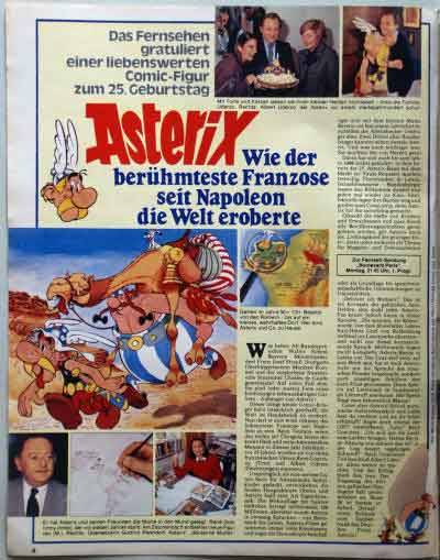 In Ausgabe 19/1984 der Zeitschrift "TV Hören und Sehen" aus dem Heinrich Bauer Verlag findet sich ein ganzseitiger Artikel "Asterix - Wie der berühmteste Franzose seit Napoleon die Welt eroberte" von Maren Wamser-Stark. Anlass der Würdigung von Werdegang, Erfolg und Bedeutung der Asterix-Comics ist deren 25-jähriges Jubiläum.