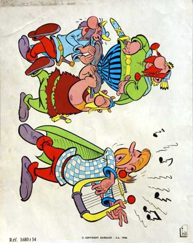 Die Schweizer Firma Jesco, die auch Abziehbilder mit identischem Titelmotiv herausbrachte, veröffentlichte ab 1966 12-seitige Malbücher jeweils im Format 31 x 24,5 cm mit Klammerbindung, kartoniertem Umschlag und der Betitelung in den drei Landessprachen der Schweiz: Französisch, Italienisch und Deutsch. Sie enthalten keinen Text und die Rückseite weist jeweils neben dem Jesco-Firmenemblem auch einen datierten Copyright-Vermerk von Dargaud sowie eine Kennnummer auf. Bekannt sind bislang folgende Ausgaben: