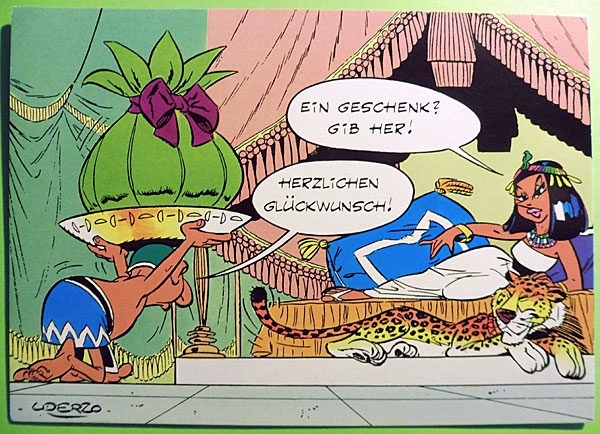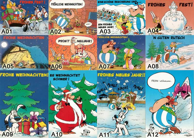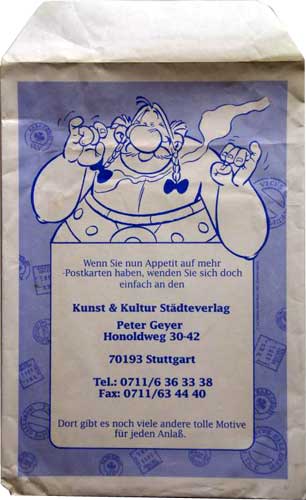 1993 ist beim "Kunst & Kultur Städteverlag P. Geyer" eine Serie von 80 Postkarten mit Motiven aus den Asterix-Abenteuern erschienen (Motivübersicht). Eine besondere Pointe bildet die Karte "Das Rezept vom Zaubertrank vom Druiden Miraculix", denn hier ist ein Rezept beschrieben, das jedoch durch den Kessel und Miraculix verdeckt wird. Im Bild ist eine Auswahl von drei Motiven zu sehen. In diesem Zusammenhang wurde auch eine Papiertüte produziert, in der womöglich die verkauften Postkarten ausgegeben werden konnten. Mindestens die Karte 029 mit dem Motiv mit Kleopatra ist auch ohne aufgedrucktem Spruch erschienen (Motiv). Die Rückseite ist mit den oben dargestellten identisch.