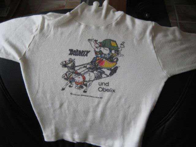 Anfang der 1970er Jahre sind Pullover mit verschiedenen Asterix-Motiven erschienen. Auf dem Etikett im Kragen steht "Orlon (R), 100 % Polyacryl" und "DuPont - Bessere Dinge für ein besseres Leben". Der rechts abgebildete Rollkragen-Pullover trägt den Copyrighthinweis "(c) 1971 Dargaud S.A Paris". Das Motiv eines zweiten Exemplars aus dem Abenteuer "Tour de France" trägt den Hinweis "(c) Copyright DARGAUD Editeur, Paris 1972".