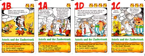 Das Quartett im klassischen Stil mit Motiven aus den Asterix-Heften - im Bild rechts das Deckblatt und die Kartenrückseite - erschien 1993 bei FX Schmid mit der Artikel-Nummer 54084.8. Jeweils vier Karten beschreiben zusammen ein Motiv aus der Serie, bspw. 1A - 1D "Asterix und der Zaubertrank". Eine Neuauflage des Spieles scheiterte am Votum der Urheber.