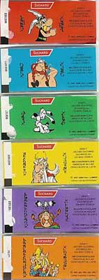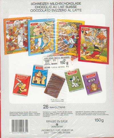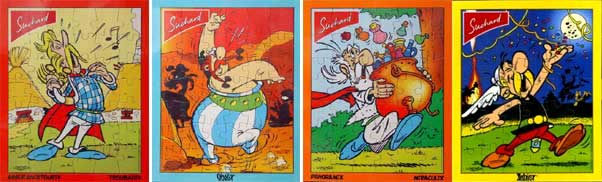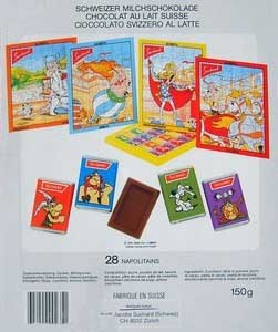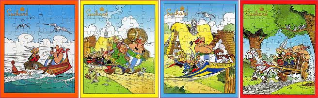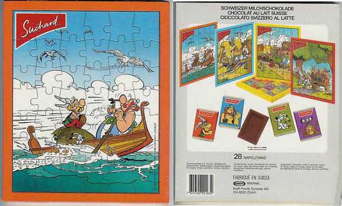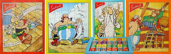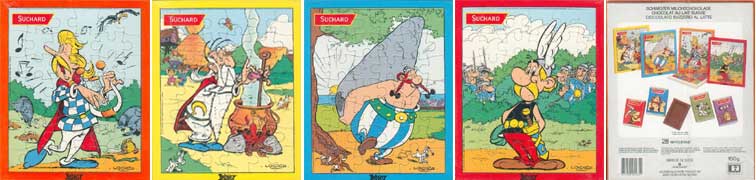 In den Packungen mit 28 kleinen Schokoladentafeln der Firma Suchard werden seit 1990 regelmäßig Puzzle mit Asterix-Motiven mit je 42 Teilen beigelegt. In der Regel erscheinen in einer zusammenhängenden Serie jeweils vier Puzzle, die auch in der Schweiz und Liechtenstein der Schokolade beilagen. Die Täfelchen selbst sind in Verpackungen mit Asterix-Motiv eingeschlagen. Die Abbildung rechts stammt aus dem Jahr 1996. Folgende Jahrgänge sind bisher bekannt: