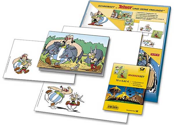 Anlässlich der Veröffentlichung von Briefmarken der Deutschen Post mit Asterix-Motiven im September 2015 bot das Unternehmen neben Asterix-Tassen auch ein Schreibset (Großansicht) bestehend aus 5 Grußklappkarten im Format A6, 2 x 5 Briefbögen im Format A4, 2 x 5 Umschläge im Format C6 und ein MARKENSET "Asterix" mit 10 selbstklebenden Marken à 0,62 € zum Preis von etwa 19 Euro an.
