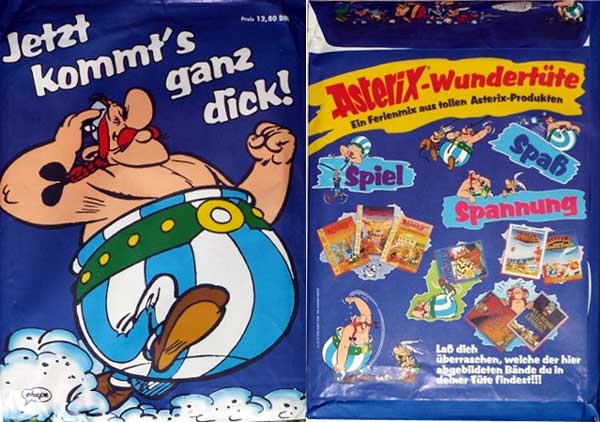 - "Jetzt kommt's ganz dick!", Preis: 12,80 DM, Inhalt: drei zufällige Asterix-Sonderbände aus den Reihen Abenteuerspielebücher, Knobelix-Sammelband, Filmbücher, Asterix-Lexika (Abbildung).