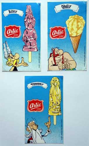 Mit Lizenz von 1985 erschien in der Schweiz Speiseeis der Firma Pierrot (heutige Marke "Lusso" des Unilever-Konzerns) in Gestalt von Asterix am Stiel in der Geschmacksrichtung Tutti-Frutti zum Preis von 90 Rappen. Ob darüberhinaus weitere Asterix-Eissorten vertrieben wurden, wie es etwa in Belgien durch die Marke "Artic Ice Cream" mit dem Copyright von 1983 geschah (Motivübersicht), die das Asterix-Eis in gleicher Form herausbrachte, ist derzeit nicht bekannt. Sollten sie über weitere Informationen verfügen, schreiben Sie bitte an den Webmaster.
