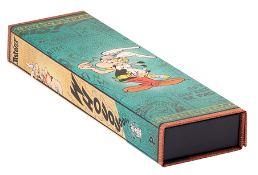 Das Stifteetui im Format Länge 220 mm x Breite 30 mm x Tiefe 68 mm hat einen magnetischen Klappverschluss. Außerdem hat es eine zusätzliche Aufbewahrungsbox im Innenraum für kleinere Gegenstände. Das Etui war entweder im orangefarbenen Design mit Asterix und Obelix als auch mit grünem Etui und Asterix mit Idefix (Motivansicht) erhältlich.