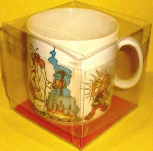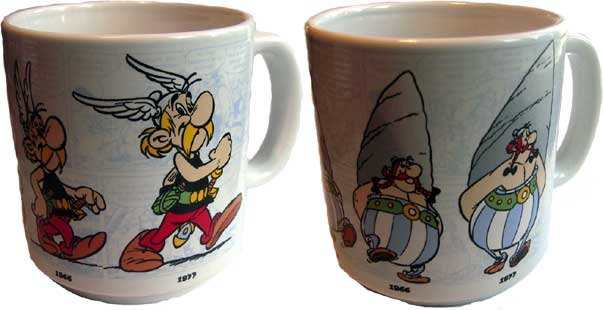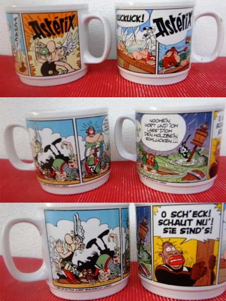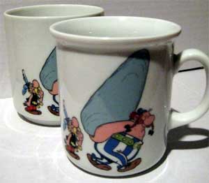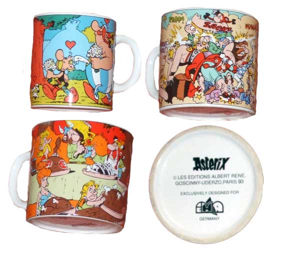 In den späten 80er Jahren war die im Bild oben abgebildete Tasse im Handel erhältlich, der Hersteller ist bisher jedoch nicht bekannt. Außerdem gibt zwei weitere kleinere Tassen mit Copyright 1988, jeweils mit Asterix- und Obelix-Motiv (beide Tassen als Rund-um-Motiv). Von Arcopal sind 1992 ebenfalls Tassen mit Motiven aus der Welt der Gallier erschienen: Asterix-Tasse mit Dorfhintergrund und eine ebensolche mit Obelix.