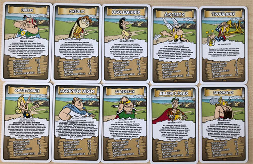 Mit 30 Karten, auf denen verschiedene Charaktere aus der Asterix-Serie mit ausführlichen Informationen abgebildet sind, gilt es, alle Karten der Mitspieler zu gewinnen. Hat Verleihnix mehr Prügelpower als Automatix? Welcher unserer gallischen Helden ist besonders gerissen oder charakterstark? Wie hinterlistig ist Julius Cäsar im Vergleich zu Greulix? Und wie steht es um Appetit und Empfindlichkeit? Kann der Appetit von Orgienorganisator Agrippus Virus mit dem von Obelix mithalten? In all diesen Kategorien muss laut Herstellerangaben groß aufgetrumpft werden, um das Spiel für sich entscheiden zu können - das Spielprinzip ist ähnlich den Auto- oder Flugzeugkartenspielen, wo es gilt die jeweiligen Angaben miteinander zu vergleichen.