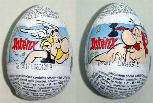 Das italienische Unternehmen Zàini Milano bot im Frühjahr 2015 in Österreich und dem deutschen Lebensmittel-Discounter "Norma" Überraschungseier mit einer Asterix-Serie von 8 Figuren und 11 Relief-Anhängern an (Motivübersicht). Zuvor war die Serie in Frankreich, auch in einem Dreierpack, der wohl auch in Österreich erhältlich war, erschienen. Da die Verpackung keine deutschsprachige Beschriftung trägt, ist anzunehmen, dass im Nachhinein Bestände im deutschsprachigen Raum angeboten wurden um den Absatzmarkt zu vergrößern oder Restbestände auf den Markt zu bringen. Die Beipackzettel sind nicht individuell für die jeweilige Figur produziert, sondern in allen Eiern identisch. Die Eier selbst sind in Verpackungen mit zwei unterschiedlichen Motiven erhältlich.