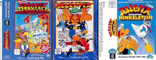 In Musikkassettengröße erschienen in den Jahren 1985 bis 1989 drei Asterix-Filme für das Format "Video 8". Es handelt sich dabei um die drei Produktionen "Sieg über Cäsar" (Marketing Film), "Asterix bei den Briten" (Marketing Film) und "Operation Hinkelstein" (Starlight), Motivübersicht.