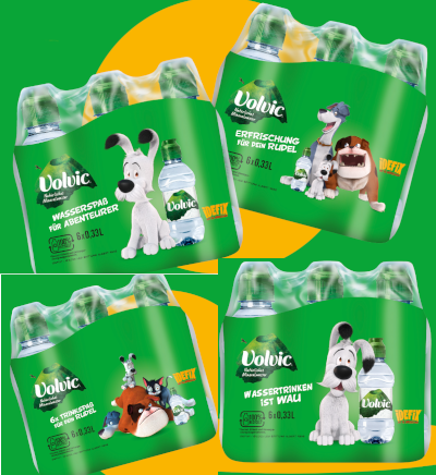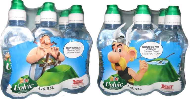 Zum Start des Kinofilms "Asterix im Land der Götter" waren im Februar 2015 unter anderem bei den Penny-Märkten in Deutschland jeweils 6 Mini-Volvic-Wasserflaschen zu je 0,33 Liter als Verpackungseinheit im Handel, die mit einer Obelix- bzw. Asterix-Abbildung bedruckt waren. Auf den Etiketten der Einzelflaschen sind jeweils Asterix, Obelix oder Idefix abgebildet.