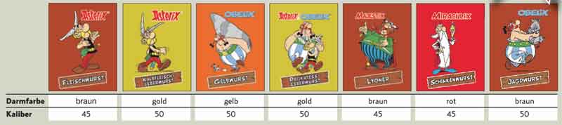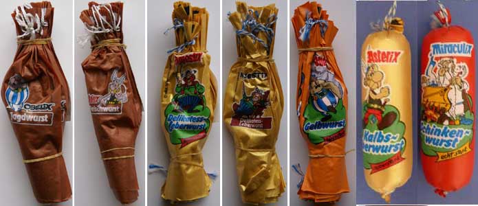 1988 und 2002 bot der Handel Wurst an, auf deren Kunstdärmen Charaktere der Asterix-Serie abgebildet waren. Die im folgenden aufgelisteten Kunstdarmhüllen stammen von der Firma CaseTech. Der Name Walsroder ist die Produktmarke des Unternehmens. Folgende Varianten sind bekannt (Motivübersicht):