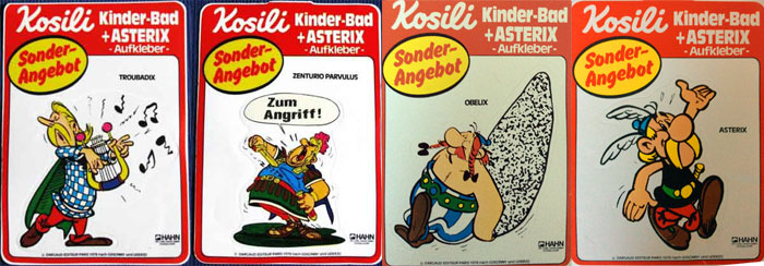 Von der Firma Dr. Carl Hahn Gmbh, Düsseldorf, einem inzwischen von Johnson & Johnson aufgekauften Hersteller für Pflegeprodukte wurde in den 1970er Jahren ein Kinderbadezusatz verkauft, der mit Aufklebern beworben wurde, auf denen Motive von Charakteren der Asterix-Serie abgebildet waren. Es ist anzunehmen, dass die Aufkleber der Verpackung beigelegen oder an der Verpackung befestigt waren.
