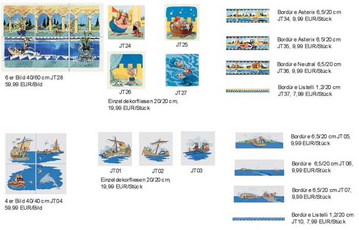 Beim Hersteller von Bädern und Badmöbeln ist 1999 eine Asterix-Serie erschienen. Verschiedene Badezimmerfliesen im Format 20 x 20 cm zeigen Einzelszenen, die Asterix und Obelix im Wasser zeigen, rechts eine Bildauswahl. Ausserdem ist eine Szene als Sammelfliese (6 x 20x20 cm, Bild links unten) produziert worden, wobei jeweils mehrere Fliesen eine Szene zeigen (Motivübersicht).