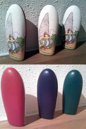 - © 1997, Hinkelsteinform: Asterix und Obelix mit Hinkelstein, Rückseiten-Variationen rot, blau und grün