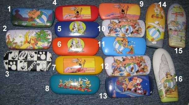 Die oberen beiden abgebildeten Etui sind in einzelnen Filialen des Optikers Fielmann verkauft worden. 2006 wurden verschiedene Etui für Kinder der Spotlight Collection bei diversen Optikern angeboten. Neben den beiden unten abgebildeten Ausgaben mit Falbala (Modell "Vela Falbala") und Obelix (Modell "Vela Obelix") in vier verschiedenen Farben gab es auch die Modelle "Baby Boom Asterix" in fünf farblich verschiedenen, transparenten Etui mit Idefix-Aufdruck, das Modell "Ghini Asterix" mit Idefix, Asterix und Obelix, die transparenten Modelle "Kristal AX" in jeweils vier Farben mit einem Obelix bzw. Kleopatra-Motiv und das Modell "Eliot AX" mit jeweils einem Kleopatra bzw. Obelix-Motiv und einem Idefix-Motiv mit Schriftzug.
