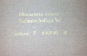 Im Horizont Verlag sind Asterix-Bände auch in einer in Kunstleder eingebundenen Sonderedition erschienen. Die neunbändige Sonderedition, die für DM 39,80 pro Band erhältlich war, enthält die bekannten Asterix-Geschichten und jeweils einen oder mehrere zusätzliche Texte über die Hintergründe von Asterix. Die ersten sieben Sammelbände sind 1986 auch in einer nummerierten Edition mit Subskriptionsurkunde erschienen, die sich durch einen goldfarbenen Stempel auf der ersten Innenseite von Band 1 auszeichnet. In den Jahren 1991 und 92 erschien eine Neuauflage der Bände 1 - 8. Zusätzlich erschien im gleichen Einband "Uderzo - auf dem Weg zu Asterix" und ein Asterix-Lexikon in braunem Softcovereinband. Abonnenten erhielten zusätzlich ein Puzzle einer Festmahlszene mit Postervorlage in der Größe 46 x 33 cm aus "Asterix bei den Belgiern", dort wird das Gemälde "Bauernhochzeit" von Pieter Bruegel mit den Charakteren aus Asterix persifliert (Bild rechts). Zudem soll der abgebildete, im Durchmesser 11 cm grosse, Aufkleber mit dem Spruch "Fahr' nicht wie ein Wildschwein!" ebenfalls der Bestellung beigelegen haben.
