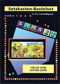- Ein Setzkasten-Bastelset der Firma "Samset" (SAMmler-SETzkasten), das für die Asterix-Figurenserie aus dem Jahre 2000 gedacht ist, konnte für 8 EURO erstanden werden (Abbildung). Das Bastelset hat die Grundmaße 30 x 14 x 7 cm und kann aufgestellt oder an die Wand gehängt werden.