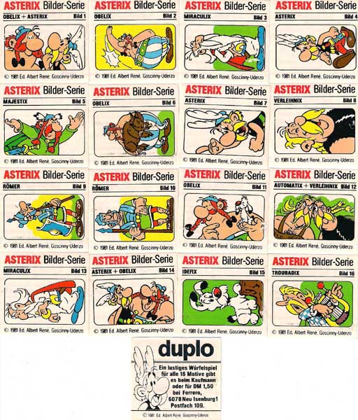 Die Firma Ferrero hat 1978 und 1981 ein Sammelbilderspiel veröffentlicht. Das erste Spiel (Bild oben) bot Platz 42 Rubbelbilder unterzubringen (Motivauswahl). Jedes der nummerierten Bilder hat einen festen Platz auf der Spielfläche. Zum Unterschied zu den Sammelbilderalben, deren Bilder man in Tütchen kaufen konnte, gab es die Bilder zum Spiel in jedem "duplo". Die 42 Bilder der ersten Ausgabe sind identisch mit den Motiven der Tattoobilder von 1976 und 1977.